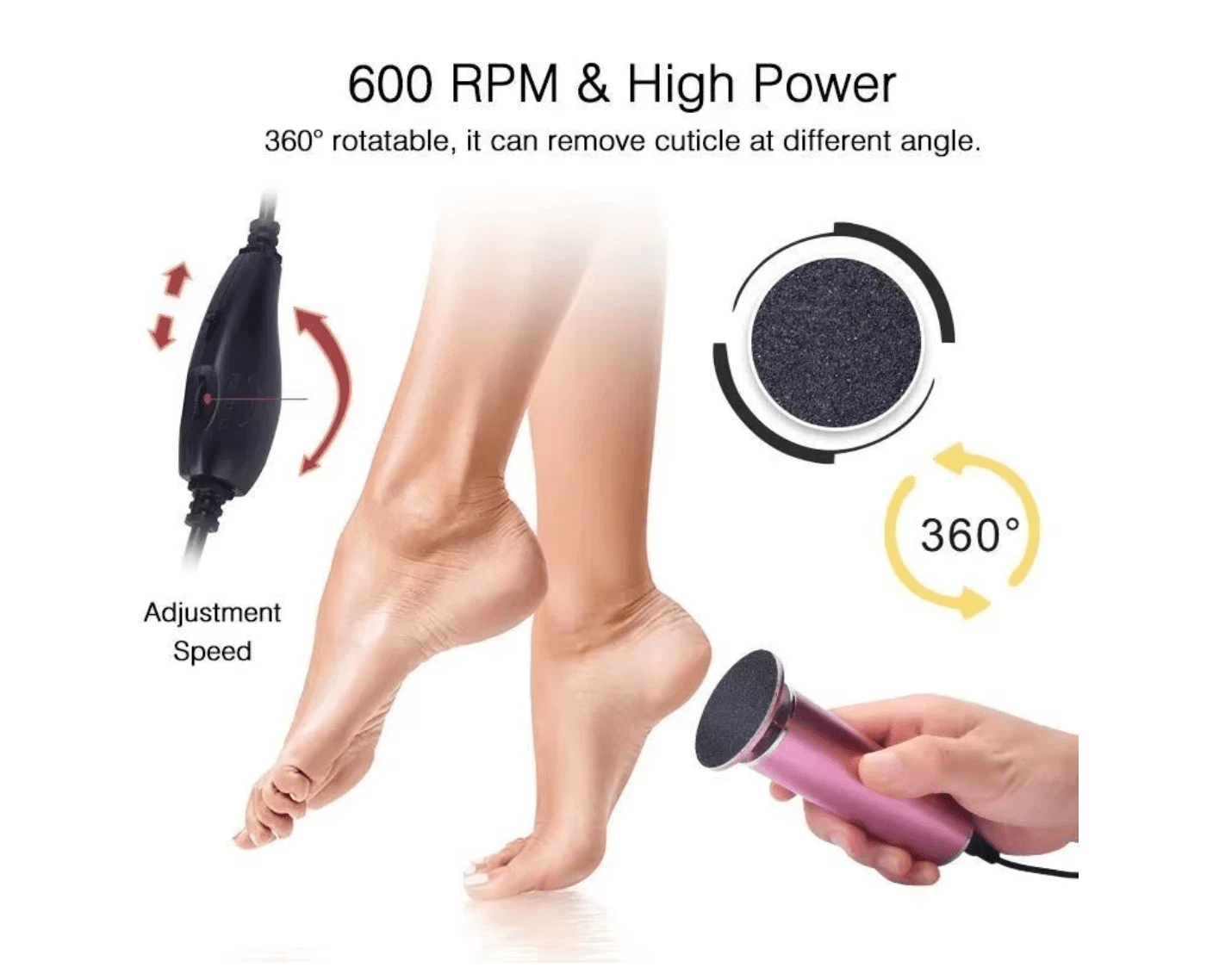 ADJUSTABLE SPEED CONTROL: Variable speed settings from 0-600 RPM allow customized treatment for different areas of your feet.
