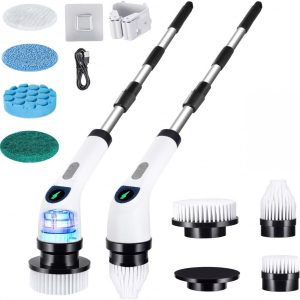 Electric Spin Scrubber for Cleaning, Adjustable Shower Brush with 7 Replaceable Heads & Power LED Display, 2 Speed Waterproof Cordless Shower Scrubber for Bathtub, Kitchen, Car, White